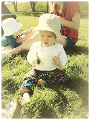 Hela förra veckan satt jag ju inne. Mest för att det var så himla varmt ute och jag hade så hög feber att jag till och med i bara blöja svettades. Därför passar jag nu på mellan regnskurarna att vara ute så mycket som möjligt. Idag till exempel så blev det en lång runda i vagnen, med mössa på!! Vart tog solen vägen?!